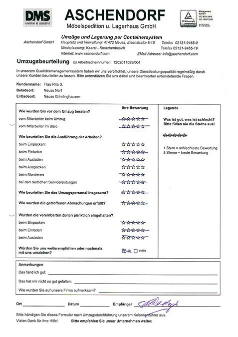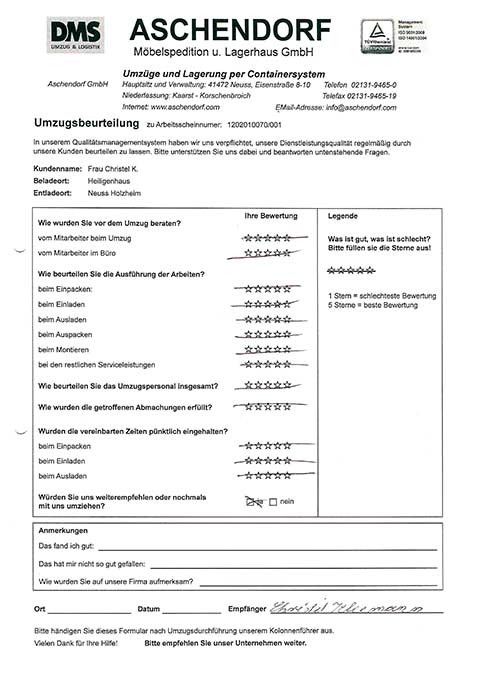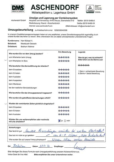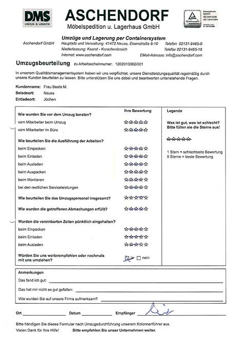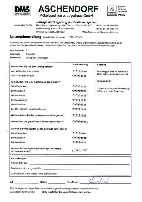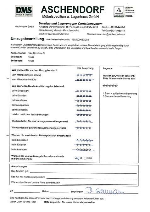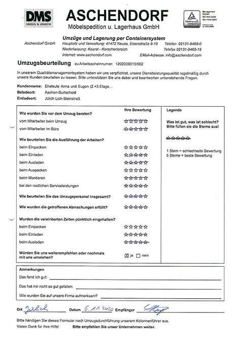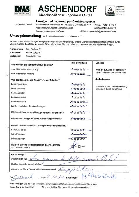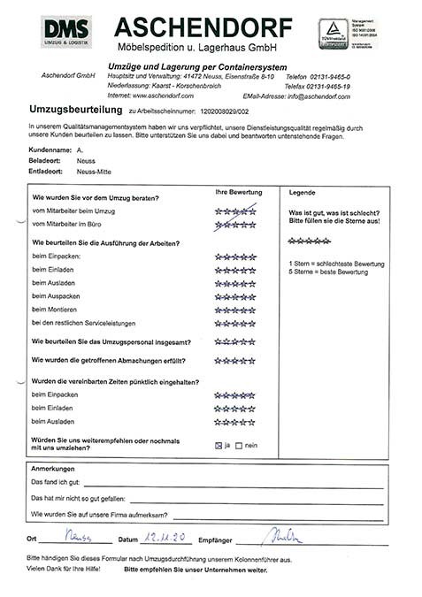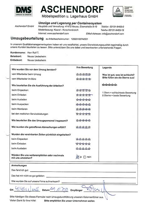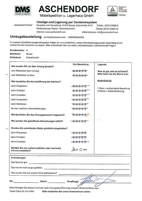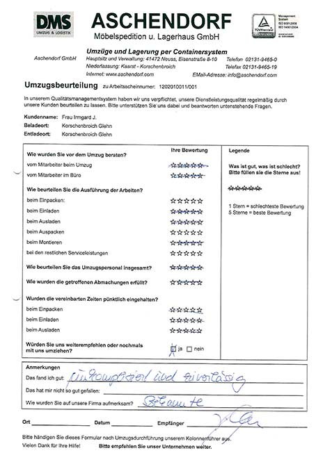 Alles hat super geklappt von der Administration bis zum Umzug und alles ist heil in der neuen Wohnung angekommen. Die Mitarbeiter waren super fleißig und sehr freundlich und hilfsbereit. Auf solche Mitarbeiter kann die Geschäftsführung stolz sein. Wenn wir noch mal umziehen auf jeden Fall wieder mit der Firma Aschendorf.