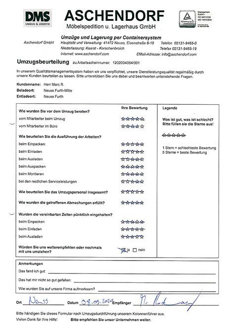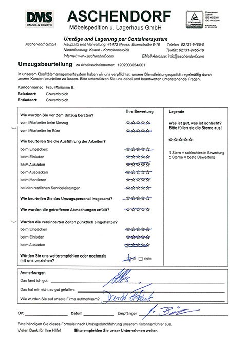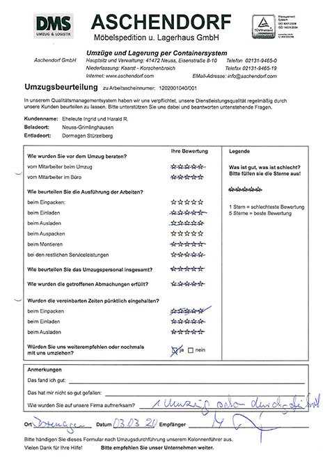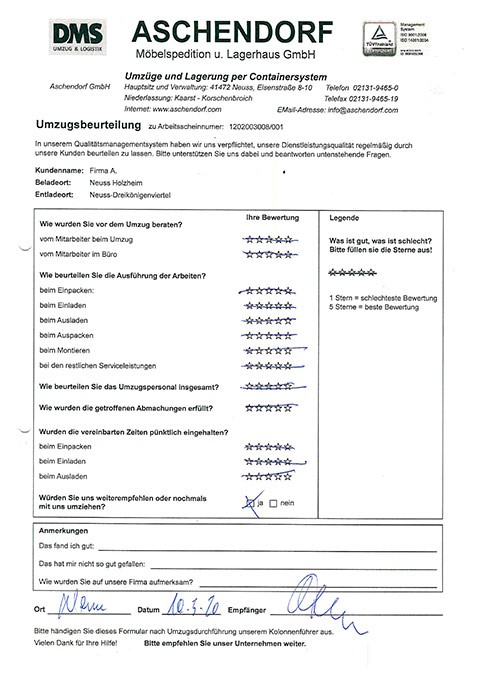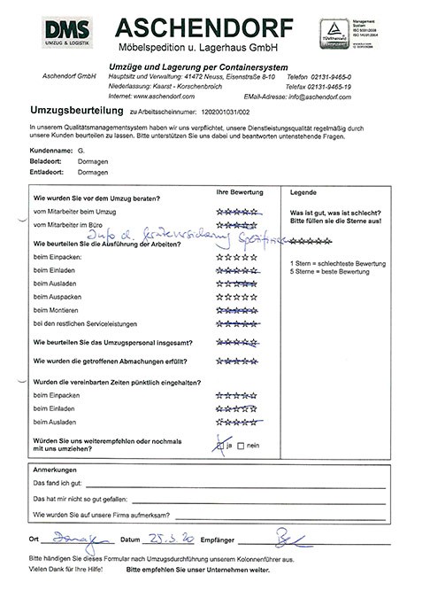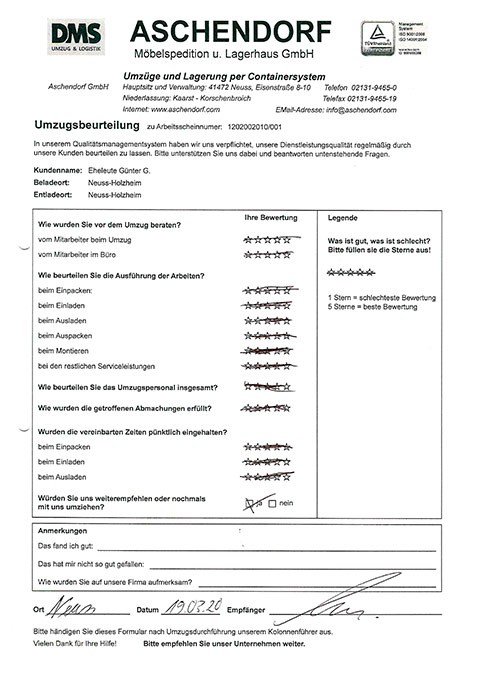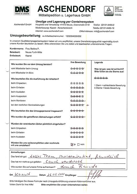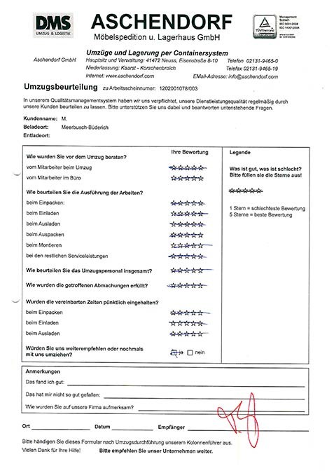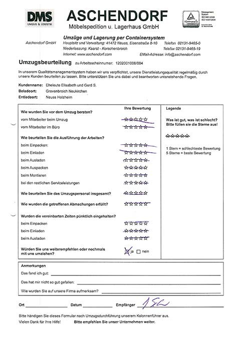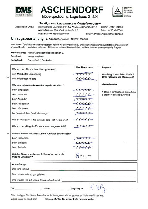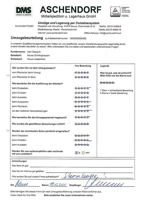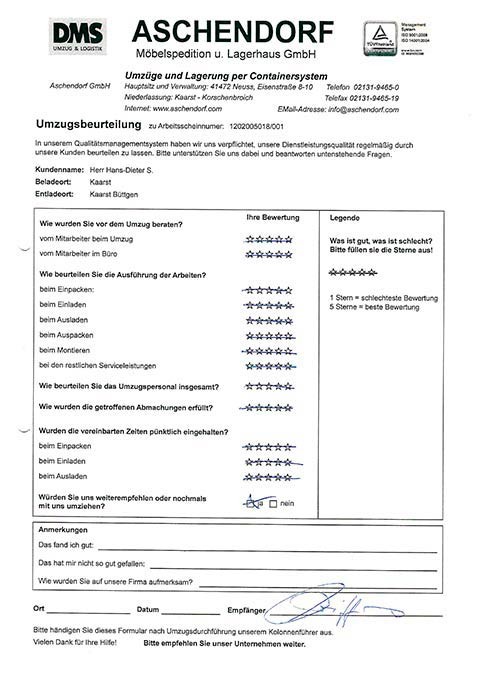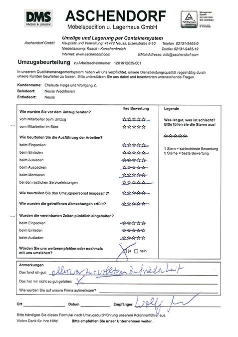 Sehr geehrte Frau Aschendorf, nun ist unser Umzug bereits etwas mehr als eine Woche her und langsam gewoehnen wir uns ein. Wir moechten Ihnen und den an der Vorbereitung und vor allem mit der Durchführung Beteigten herzlich danken. Zwar haben wir die Umzugsbeurteilung ausgefuellt, doch kann man mit Worten mehr als mit der "Streichung von Sternchen" seine Zufriedenheit ausdruecken. In der Zeit der Vorbeitung des Umzugs hatte ich insbesondere wegen der Corona-Krise mehrmals u.a. mit Frau Bernsen und Frau Mueller telefoniert, und ich hatte nie den Eindruck, laestig zu fallen. Beim Eintreffen Ihrer Leute am 18.04. in Kapellen hatte ich direkt einen guten Eindruck: Sie hatten sich freundlich vorgestellt, und nachdem sie sich einen Ueberblick über die zu bewaeltigen Arbeiten verschafft hatten, "legten sie sofort los". Ich merkte sofort: die Maenner verstehen ihr Handwerk und waren als Team eingespielt. Es durfte trotz schwieriger Arbeit auch einmal gelacht werden, das hat mir besonders gefallen. Was man so alles in einen Lkw bei guter Kenntnis verstauen kann, hatte mich beeindruckt. Am Dienstag (21.04.) trafen Herr Fegrs, Herr Nagel und Herr Schwilling pünktlich in Potsdam, der ersten Entladestelle, ein. Am Mittwoch und am Donnerstag wurde entladen und eingeraeumt. Dabei zeigte sich erneut wie ein eingespieltes Team selbst schwierige Aufgaben loesen kann. Es wurde nicht einmal ein Glas beschaedigt. Meine Frau und ich waren sehr zufrieden und sprechen heute noch darueber, wie gut alles "geklappt" hat. Wir sind der Meinung, dass es fuer uns ein Glueckfall war, dass sie dieses Team mit unserem Umzug beauftragt haben. Wir waeren Ihnen sehr dankbar, wenn sie den Herren Marcel Fegers, Jupp Nagel und Macel Schwilling auch auf diesem Weg noch einmal unseren besten Dank und viele gruesse aussprechen wuerden. Ihre Rechnung werde ich am Montag anweisen, weil am Wochende zu viele "Haecker" unterwegs sind. Nochmals besten Dank und viele Gruesse aus dem"Osten". Ingrid und Udo Wloka