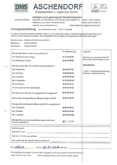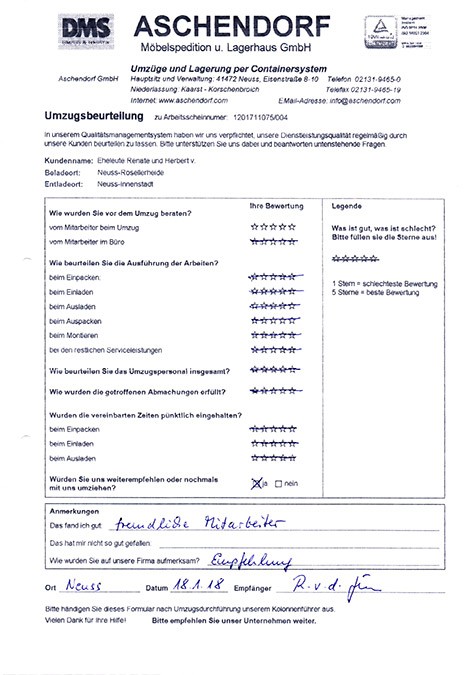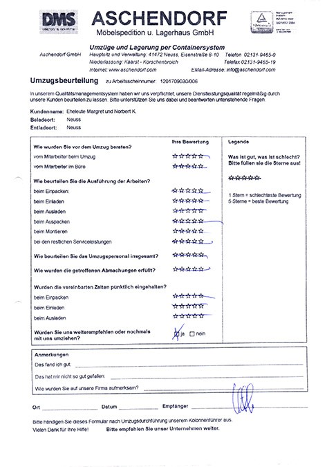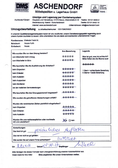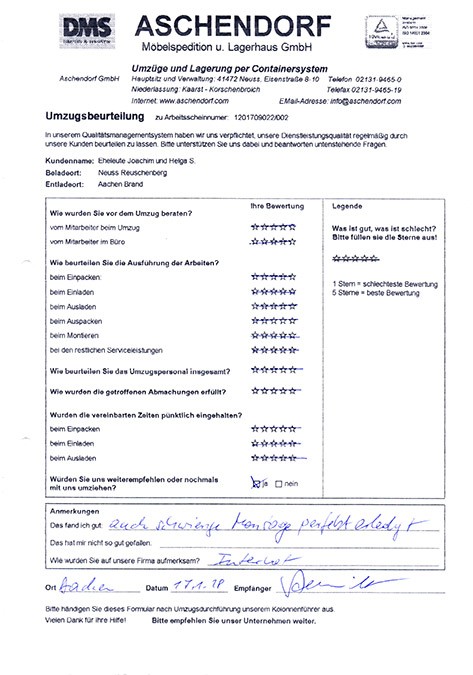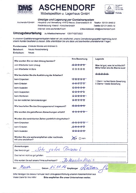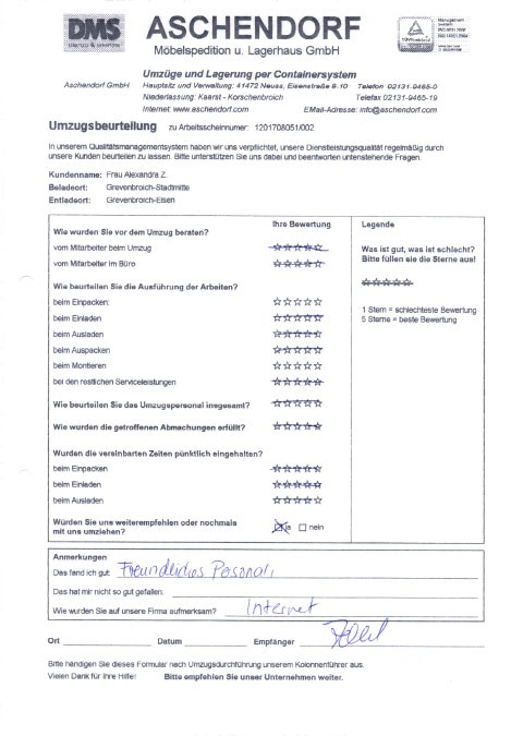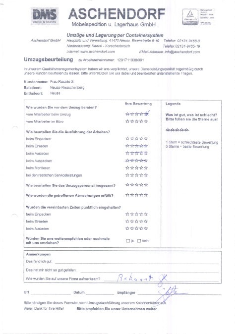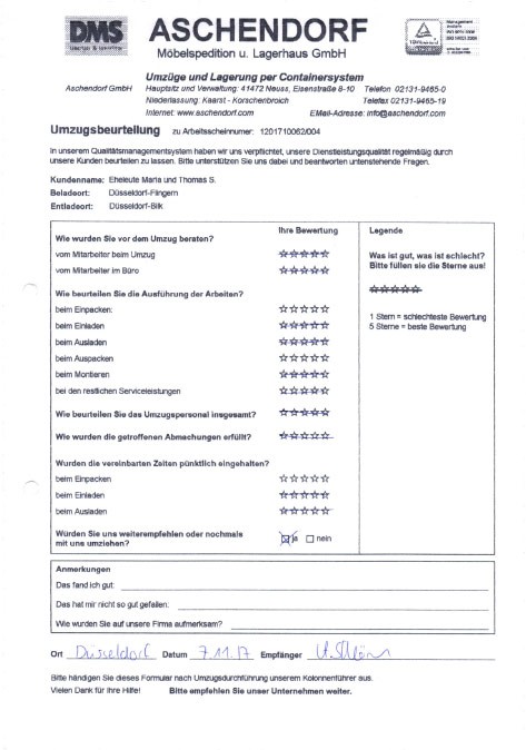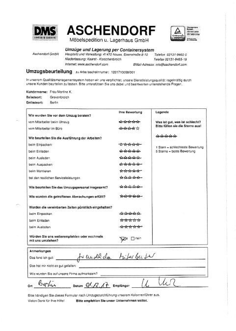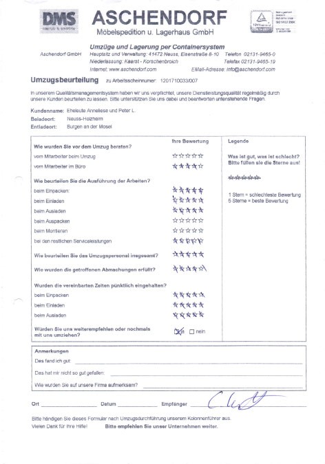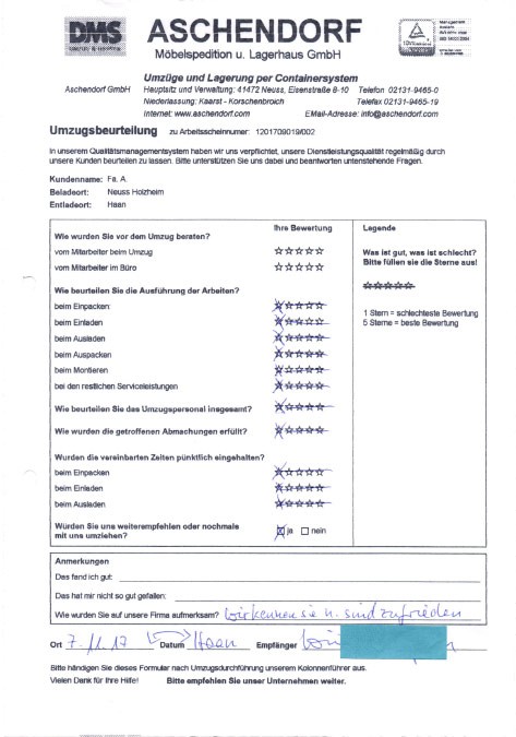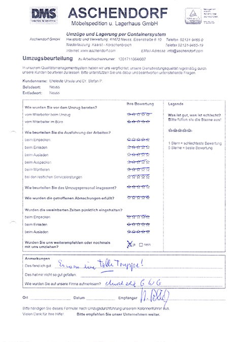 Sehr geehrter Herr Aschendorf, wir haben heute dankend Ihr Schreiben mit dem beigefügten Kalender erhalten und ich möchte diese Gelegenheit nutzen, Ihnen im Nachgang zu unserem Umzug (mit etwas Verspätung) ein sehr positives Feedbackzu geben. Wie waren nicht nur mit der Betreuung und Organisation durch Sie persönlich im Vorfeld des Umzuges höchst zufrieden, sondern auch mit der sehr professionellen Unterstützung durch das von Ihnen gestellte Team an den Umzugstagen vor Ort. Ihre Mitarbeiter waren fleißig, entgegenkommend und trotz der vielen Arbeit immer freundlich. Diesen Eindnrck hatte nicht nur ich, sondern mehrere meiner Kolleginnen und Kollegen haben mir eine Rückmeldung gegeben, die sich mit meinem sehr positiven Eindruck deckt. Im Ergebnis sind wir froh, dass wir uns auch mit unseren zweiten Umzug für Sie entschieden haben, und ich werde Sie gerne weiterempfehlen, sollte sich mir eine Gelegenheit ergeben. Ich wünsche Ihnen schöne Weihrachtstage und einen guten Rutsch ins neue Jahrl A.P.